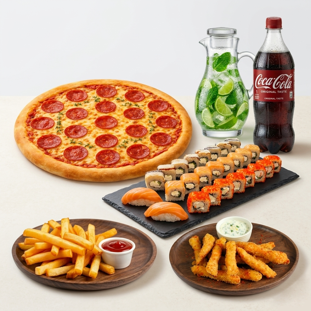 Пицца Пепперони 40 см, Сет Классик, Стрипсы, Картофель фри, Coca-Cola 1 л. и Мохито 1л.